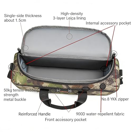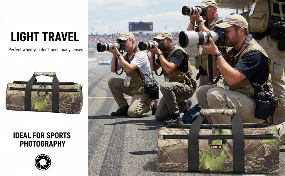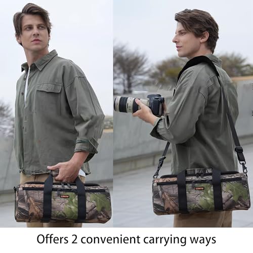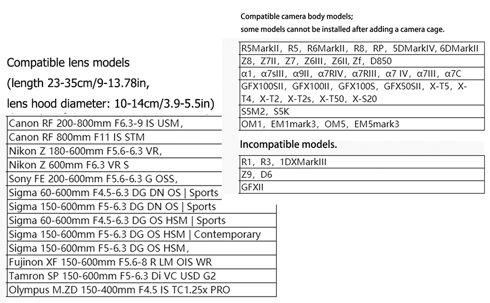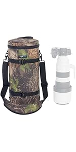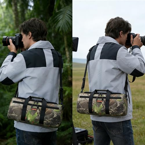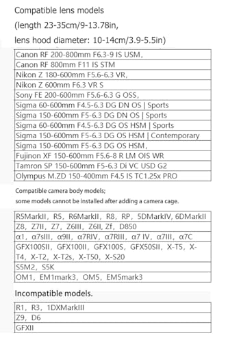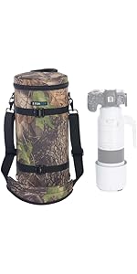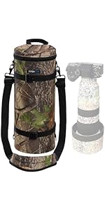 Camo shoulder bag compatible with multiple lens models: Suitable for lenses with a length of 23-35cm/9-13.78in and a lens hood diameter of 10-14cm/3.9-5.5in. For example: for Nikon Z 600 F6.3, for Sigma 150-600/60-600, for Fujinon XF 150-600, for Olympus 150-400 F4.5. Suitable camera bodies: for Canon R5 Mark II/R6 Mark II/R5, for Nikon Z8/Z7/Z6, for Sony A9/A7, etc. Please note that this bag is not compatible with some models when a camera cage is attached.