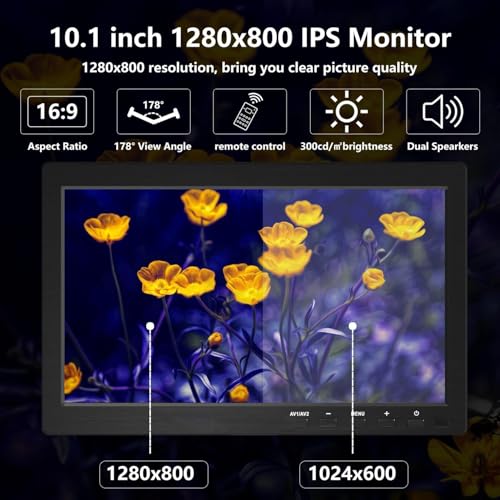 10.1 Inch Small Computer Monitor, Built-in Speakers, 1280 x 800, MINI HDMI Display 60 Hz, 3ms, IPS Screen Display w/Remote Control, HDMI VGA AV BNC Inpu