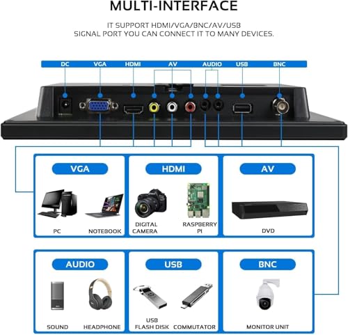 2.【Rich Input Interface】This small security monitor provids several input ports, including 1 x HDMI port for DSLR,PC or other devices with HDMI port, 1 x VGA port for PC or Laptop. VCD,TV-Box and so on,1 x BNC port for CCD or CCTV.