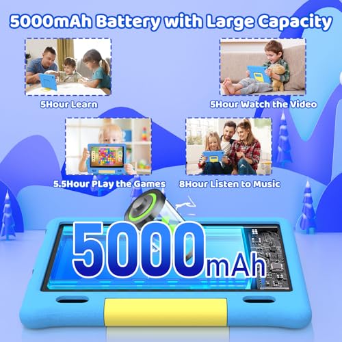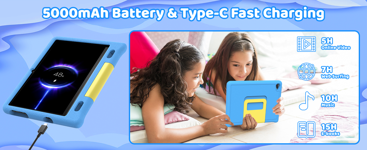 - 【5000mAh Durable Battery & Type-C Fast Charging】The android 15 tablet for kids is designed for beginners and gamers, equipped with a durable 5000mAh polymer lithium battery that can be used continuously for up to 6 hours (for streaming, educational applications, drawing, or gaming). The android 15 tablet is equipped with a USB Type-C port for fast and convenient charging, ensuring that the tablet always provides power for the child's next activity without waiting any longer.