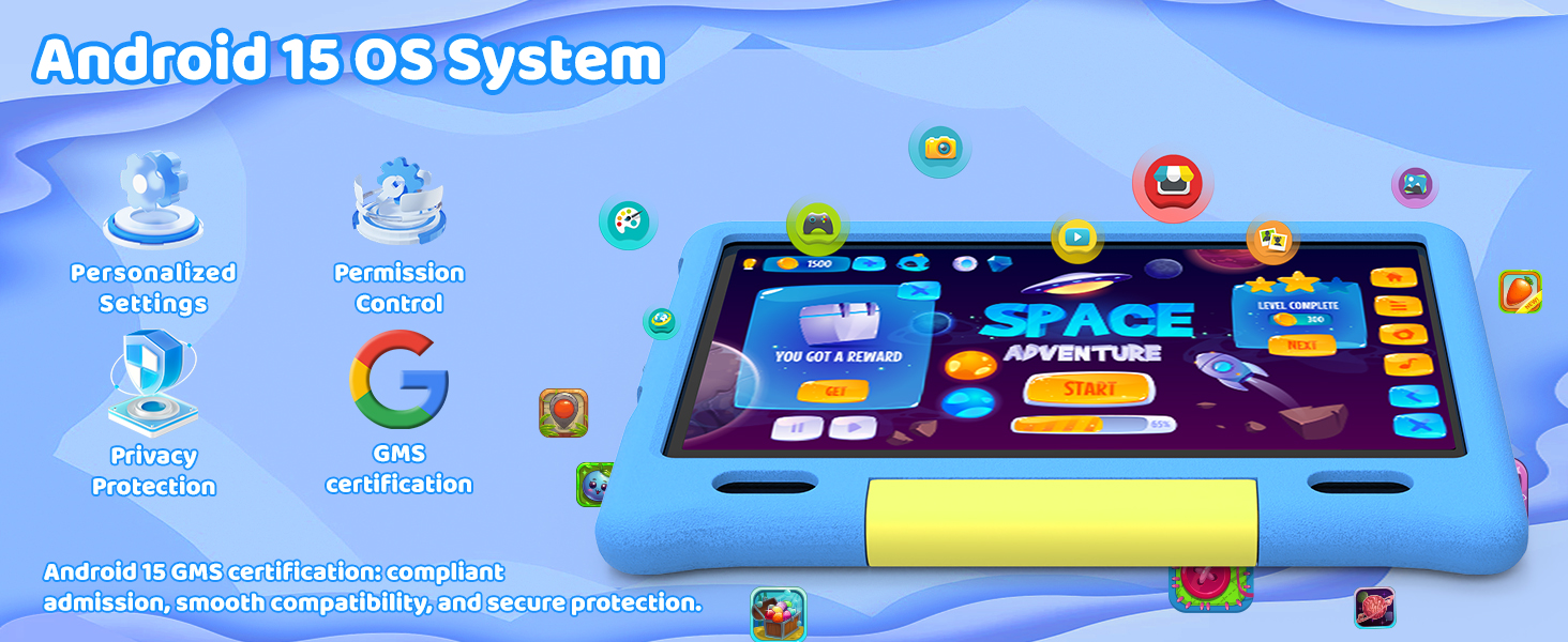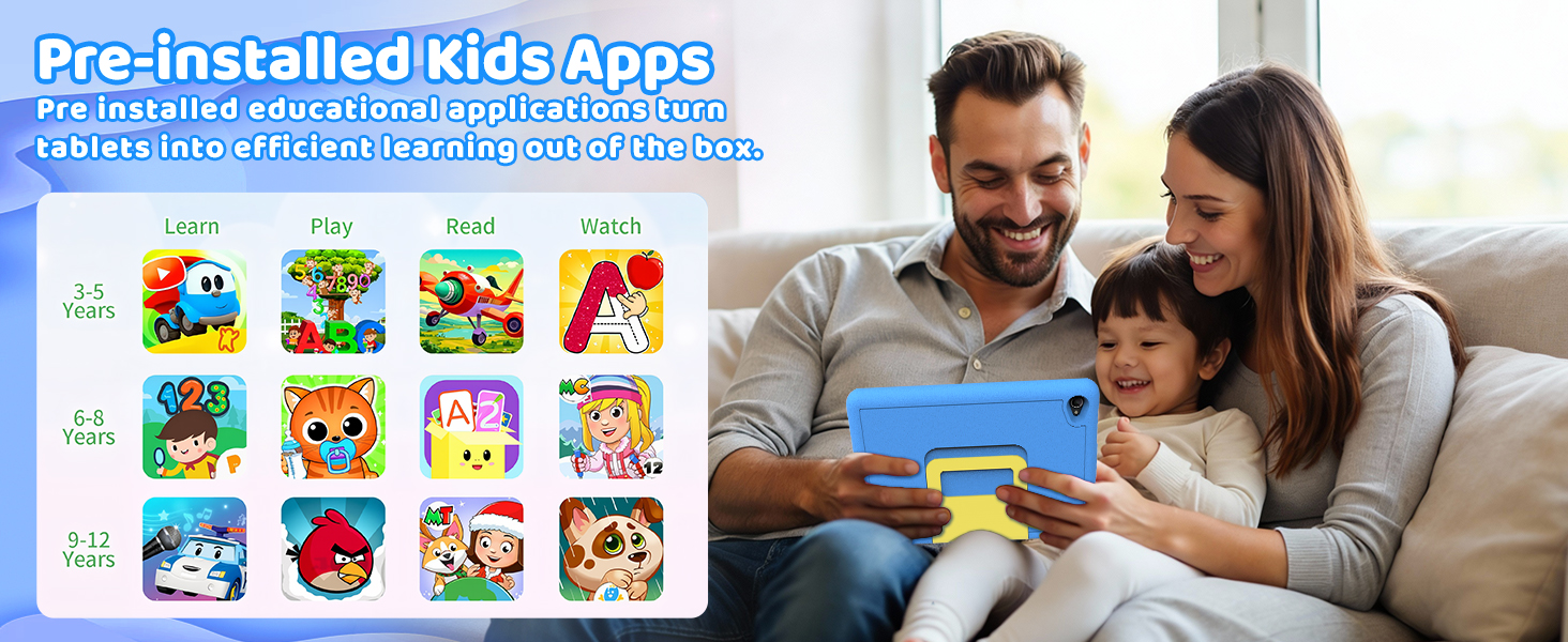 - 【Smart Parental Controls & Pre-installed kids Apps】Our Android 15 kids tablet is designed specifically for digital learning and gaming, with intuitive and powerful parental controls and pre-installed child friendly applications that integrate safety, convenience, and fun. This kid tablet can customize user profiles, set daily screen time limits, filter age appropriate applications/websites, and easily monitor activity logs. Let your children learn, play, and explore in a safe environment tailored specifically for them.