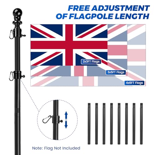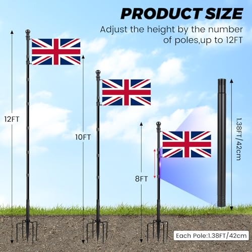 [Adjustable Height] Flag pole kit features a multi-section design, allowing you to add or remove poles to adjust the height to your needs. Extending up to 12 ft/3.66 m, it's versatile enough to fit in corners of your yard or the center of your lawn, perfect for everyday decoration, holiday celebrations, and event promotions