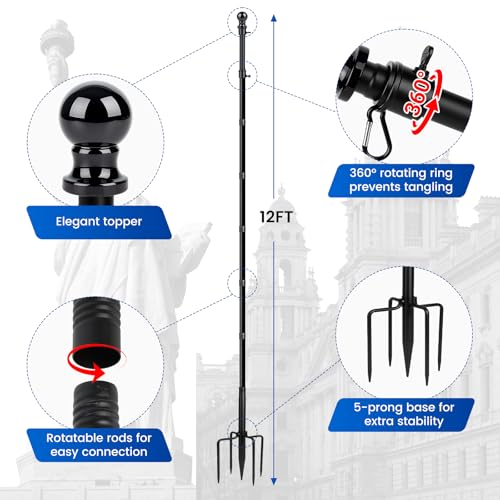12 FT Flag Pole for Garden, Flagpole Kit with 5 Prongs Base