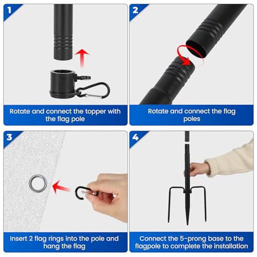 [Easy Installation] The flagpole kit includes 8 poles, a five-prong base, a pole head, and 2 flagpole rings. Simply twist and tighten each flagpole tube together—no complicated tools required. It can be folded down when not in use, saving space and making it easy to carry and store