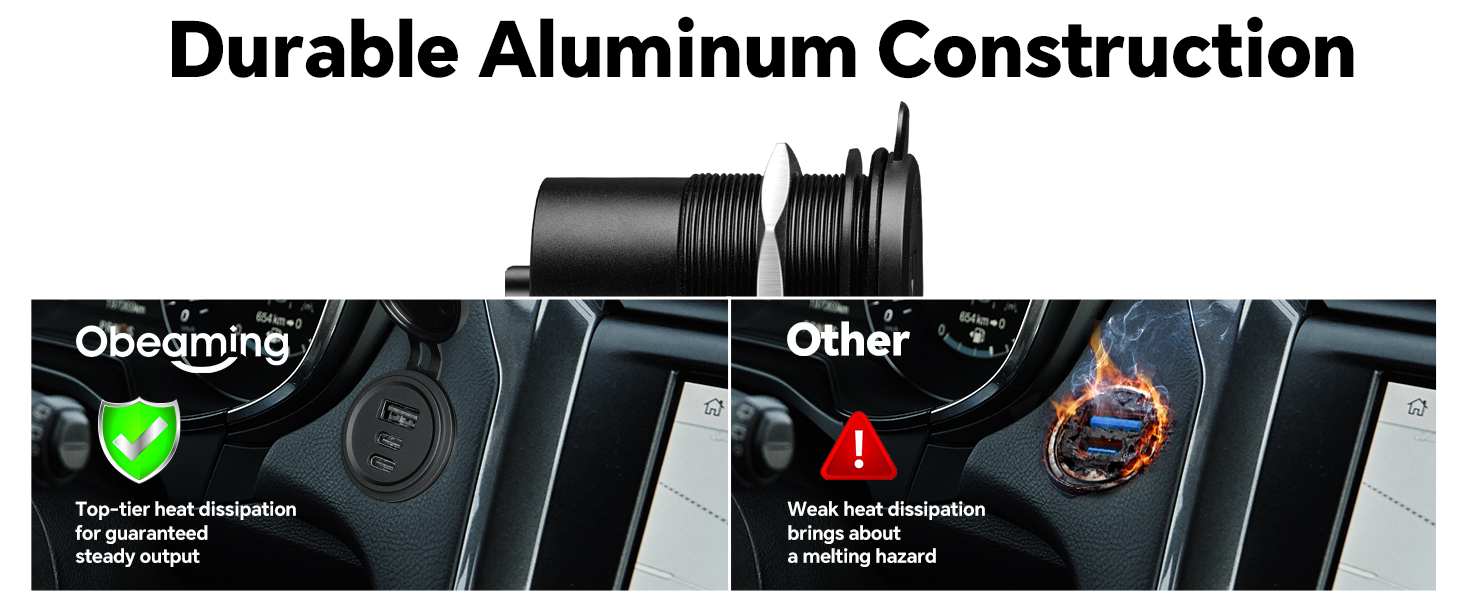 - All-Aluminum Made, Built For Last: Made of all-aluminum materials with premium heat transfer capability for stable power output and fast charging performance. Aluminum constructed USB charger socket is much sturdier and more safer than plastic chargers