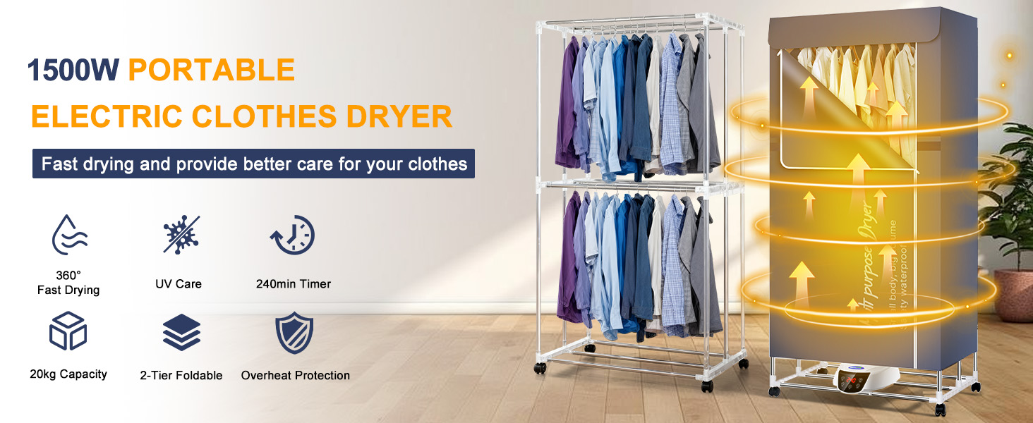 【Quick-Dry & Freshness Care】Equipped with a powerful 1500W motor and a dual-ball DC fan, this dryer delivers fast and efficient drying. Combined with gentle UV light, it helps keep your clothes fresh and hygienic without damage.