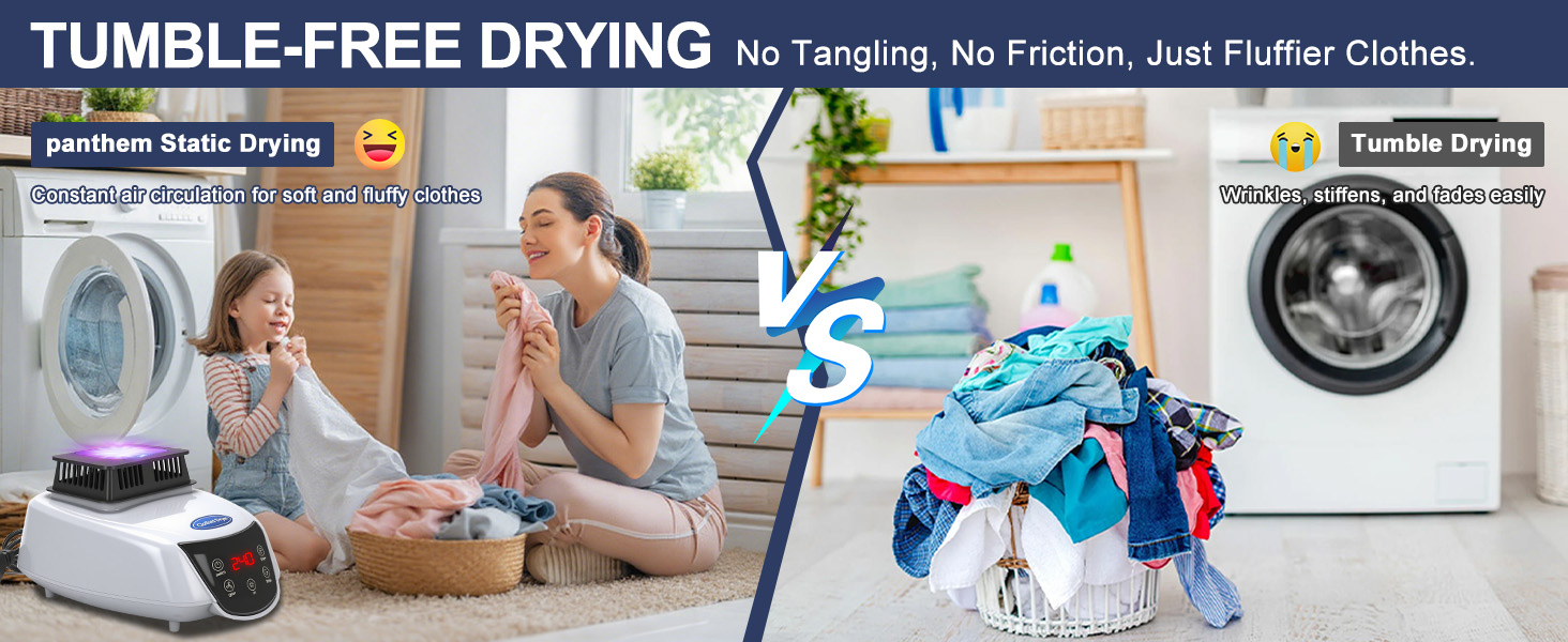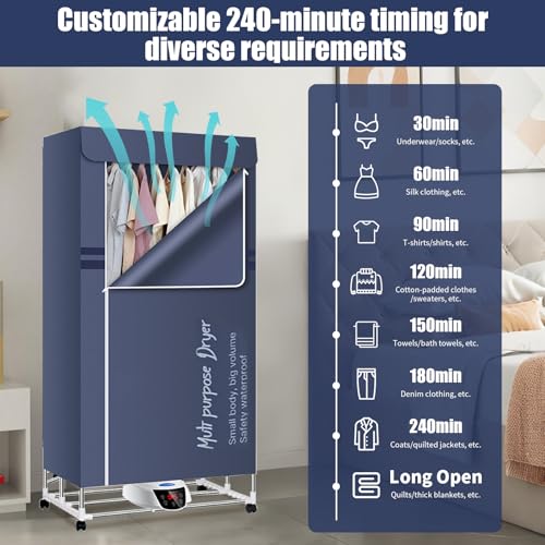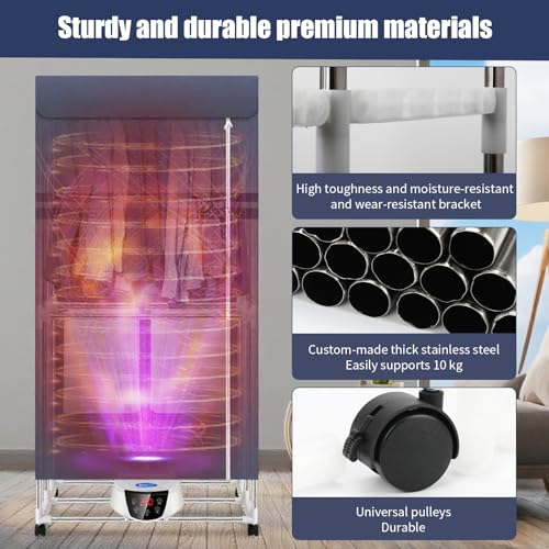 【Smart Drying with Remote Control】Take control with a 240-minute adjustable timer and multiple heat modes: Air Dry (No Heat) – ideal for delicate fabrics like silk; Low Heat – perfect for socks, lingerie, and everyday shirts; High Heat – best for thick items like jeans and towels; Continuous Mode – great for duvets and heavy blankets. Save energy while keeping your clothes in great condition.