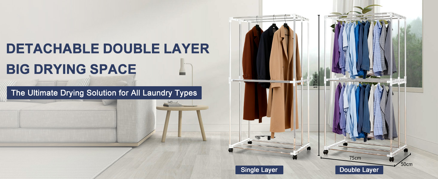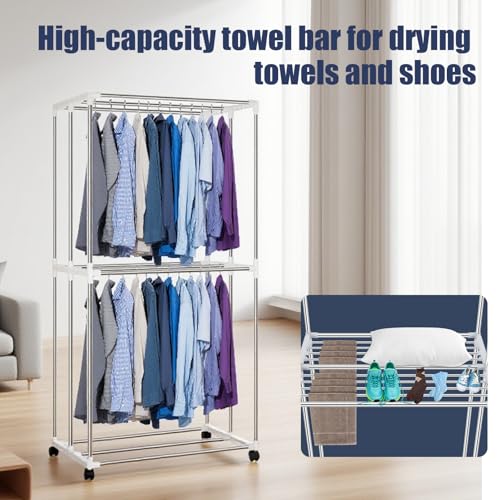 【Sturdy & Multi-Functional Design】Built with reinforced stainless steel tubes and durable ABS resin joints, this airer supports up to 10kg per tier (20kg total). It also includes 8 removable towel bars for small items – easily taken off to accommodate longer garments. Four smooth-rolling casters make moving it around effortless.