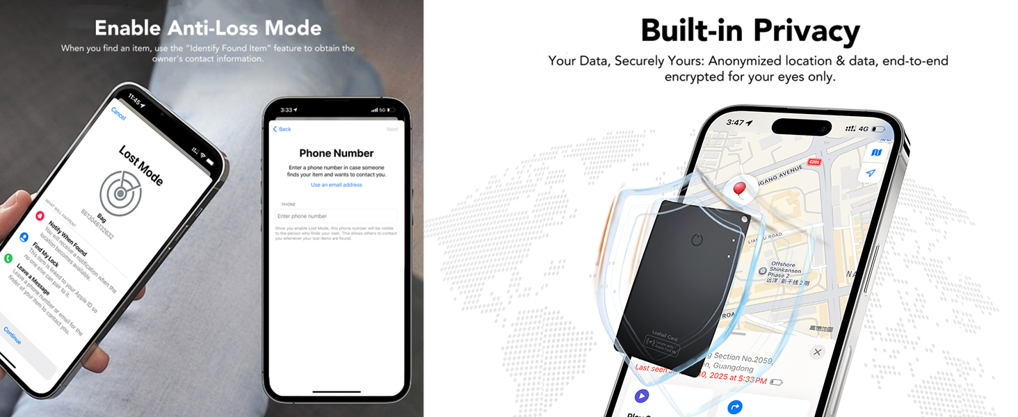2. Lost Mode for Added Security: Misplace your wallet finder card? Enable Lost Mode directly from the app to lock your tracker device and display a custom message with your contact info. Anyone who finds your credit card tracker for wallet can view your details without accessing any personal data, making recovery quick and secure.- No extra charges.