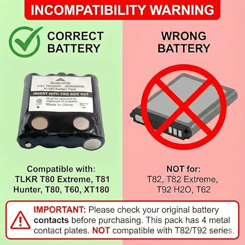 - Important Fitment Note: Please check your original battery contacts before purchasing. This pack has 4 metal contact plates. NOT Compatible with T82, T82 Extreme, T92 H2O, or T62 series (which use a different battery shape).