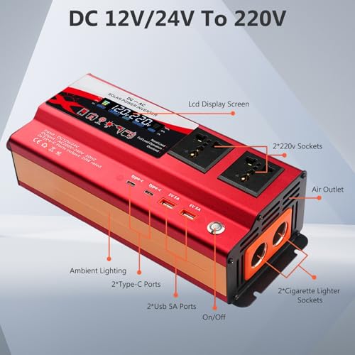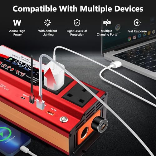 Kocusu 2000W Car Power Inverter 12V to 240V with 2 Type-C,2 USB,2 AC Sockets and 2 Cigarette Lighter and LED Display,Mood Lighting for Travel,Camping,RV,Emergency Power Supply