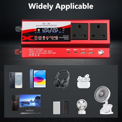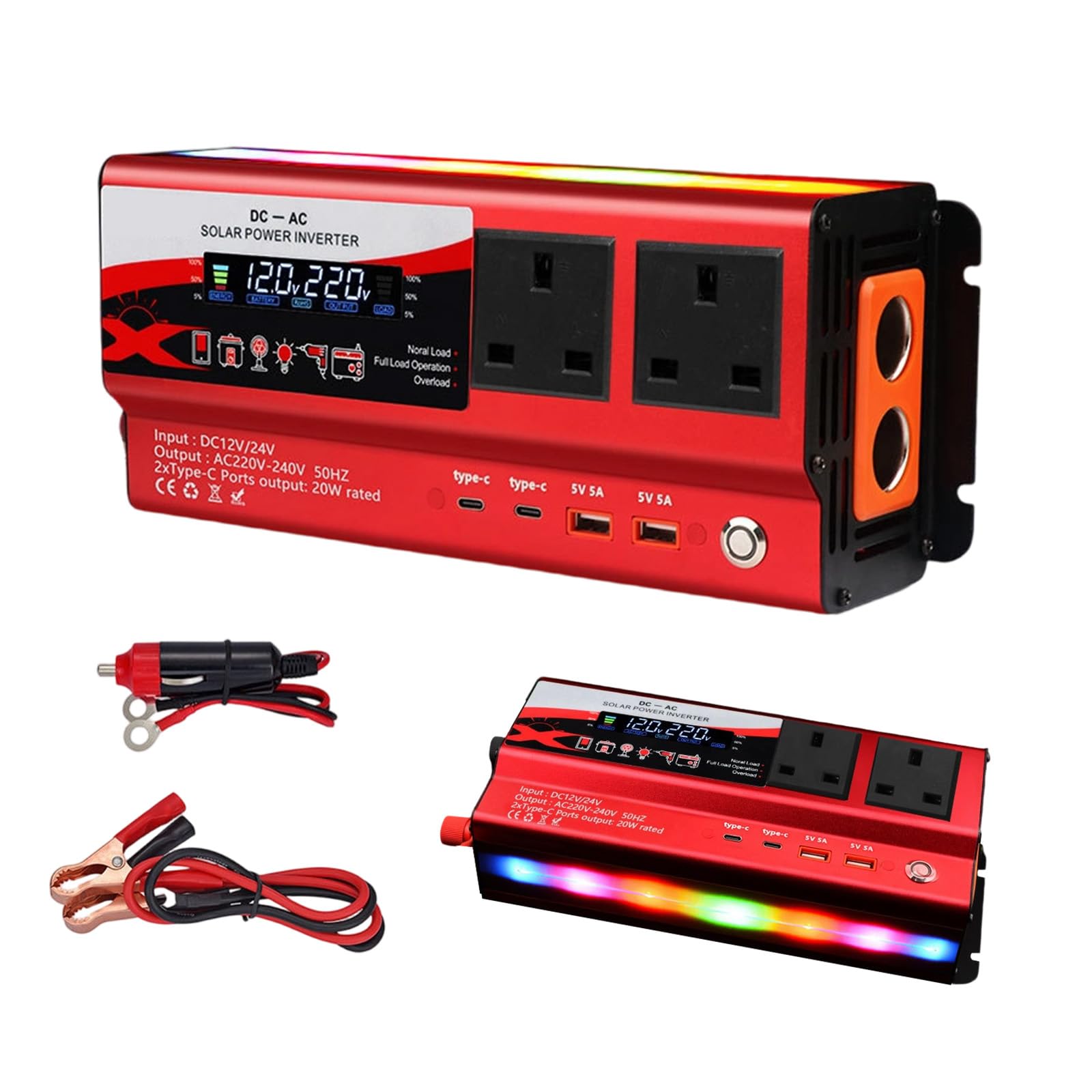 2000W Power Inverter DC 12V/24V to AC 220V, Car Power Inverter with 2 UK Sockets, 2 Type-C,2 USB, 2 Cigarette Lighter and LED Display, Pure Sine Wave Inverter for Travel, Camping, RV