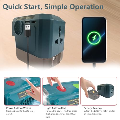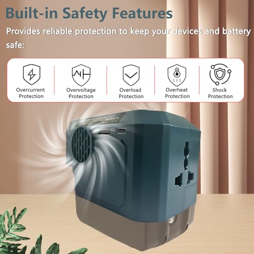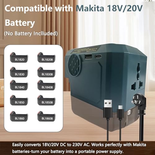 Compatible with Makita 18V Batteries: This portable battery inverter works with Makita 18V lithium batteries including BL1860 BL1860B BL1850 BL1850B BL1840 BL1830 BL1820B etc. A reliable DC to AC inverter solution for turning battery power into real-world utility. Note: Battery not included.