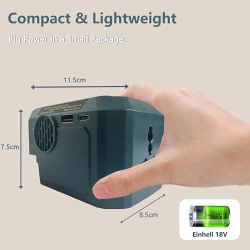 Product Type: Portable Battery Inverter Rated Power: Max 200W Output: 220-240V AC USB-A Output: 5V 2.1A TYPE-C Output: 18W LED Light: 300Lumens Battery Compatibility: Compatible with 18V Lithium Ion Batteries BL1430 BL1440 BL1450 BL1460 BL1815 BL1830 BL1840 BL1850 BL1860 BL1430B BL1460B BL1830B BL1850B BL1860B and More. (Batteries not included).