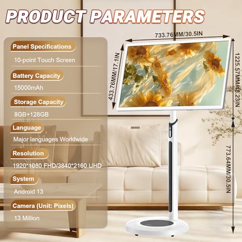 - ● 【Multifunctional 】:Detachable charging base, multi-scene shuttle living room/kitchen/outdoor, this floor-to-ceiling mobile TV supports whiteboard function, projection, and can run various applications, suitable for live broadcast, fitness, training, entertainment and other applications.