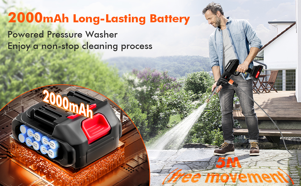 【2 High-Capacity 2.0Ah Rechargeable Batteries】The battery-powered portable pressure cleaner provides 2 high-capacity 2.0Ah batteries to ensure long battery life, more convenient for continuous use, no need to replace batteries frequently. This battery is also suitable for various power tools, value for money.