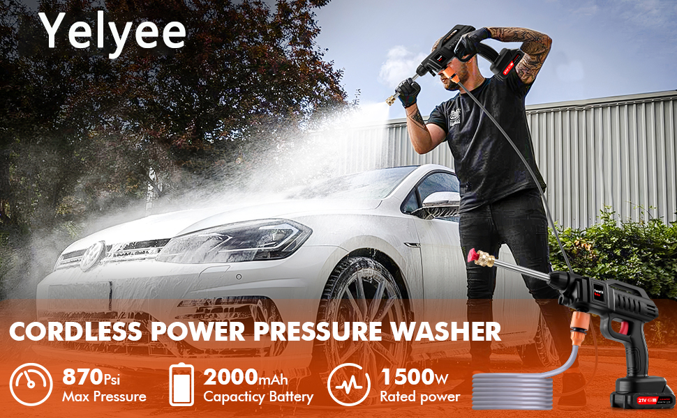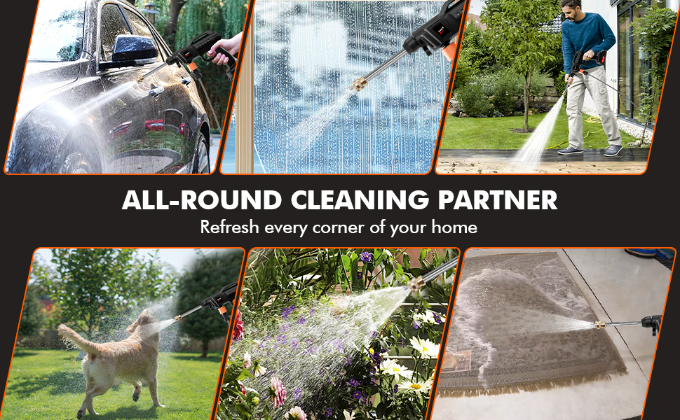 【Powerful High Pressure Cleaner】Cordless Power Cleaner offers a powerful 1500W motor capable of spraying up to 215L/H. Convenient portable power washer allows you to clean all outdoor spaces and equipment easily and quickly. Pressure: 30 Bar~60 Bar, Flow Load: 4 L/Min~8 L/min. Speed: 15,000 RPM.
