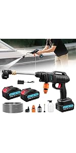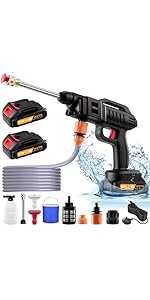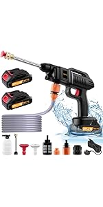 【Wide Application and Complete Accessories】In addition to washing cars, it is also suitable for cleaning yards, pets, bicycles and roofs as well as watering flowers. Package Includes:2*2.0Ah Batteries,1*Main Unit,1*5M Water Hose,1*Foam Bottle Nozzle,1*Charger,1*Extension Pole,1*Owner's Manual,2* 0°/40° Swivel Nozzles,1*Hose Connector,1*Water Filter.