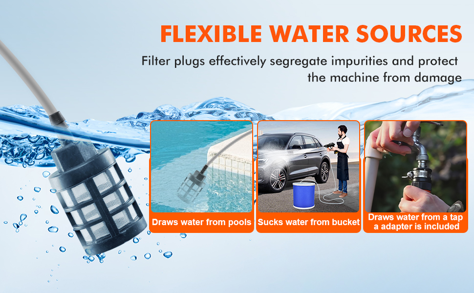【2 Kinds of Nozzles, 5m/16.5ft Water Hose】The cleaner has a cordless design and is equipped with 2 different nozzles for you to use: 0°, 40° nozzles.The 40° water outlet nozzle sprays water mist, which is suitable for watering gardens and irrigating plants. The 0° nozzle delivers a direct and powerful jet of water to remove stubborn stains. Also with Foam Bottle nozzle, the water comes out more dense, multiple choices to meet your cleaning needs in cleaning car, garden, pool, floor and more.