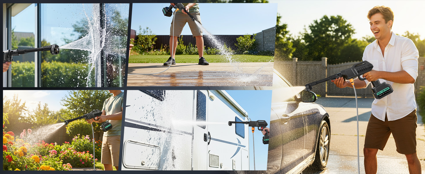 【High Pressure Washer】: Portable high-pressure washer with a range of up to 10 meters. Suitable for cleaning cars, driveways, walls, floors, swimming pools, windows, and pet showers.