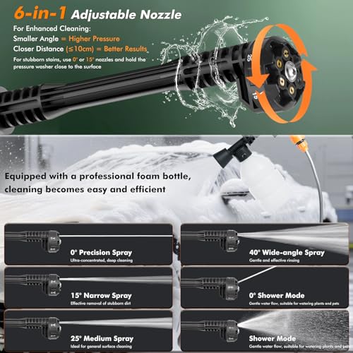 【6-in-1 Adjustable Nozzle】: Water pressure can be easily changed by adjusting the nozzle. Simply switch nozzles to use 0°, 15°, UP, 40°, and 0° shower and spray modes. Water pressure can be adjusted according to the condition and location of the stains, and the included soap bottle makes removing stubborn stains even easier.