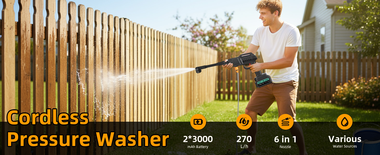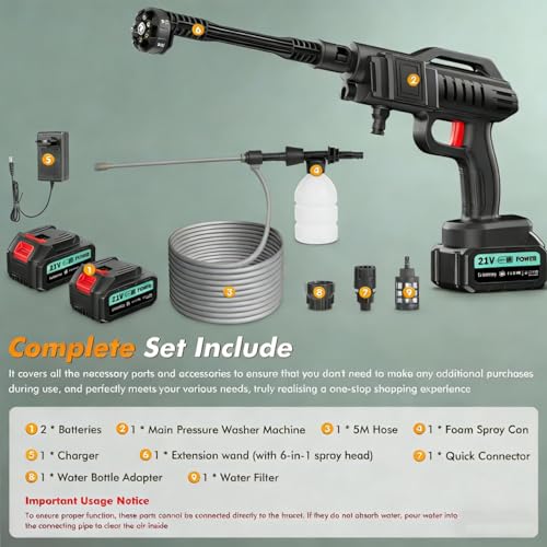 【You Will Receive】: 1 cordless pressure washer, 1 21V charger, 2 batteries, 1 quick connector, 1 water bottle connector, 1 16cm short hose, 1 5m water hose, 1 water filter, 1 foam spray can, 1 6-in-1 nozzle.