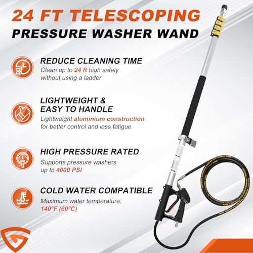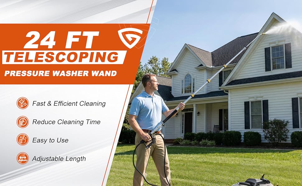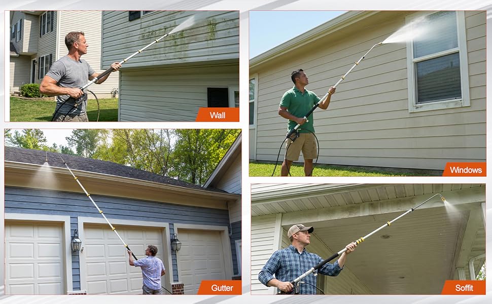 - 【 Clean High & Hard-to-Reach Areas Safely】This 24ft telescopic pressure washer wand allows you to easily clean gutters, roofs, fascias and high walls without ladders or climbing. Ideal for safe and efficient exterior cleaning on houses and tall buildings.