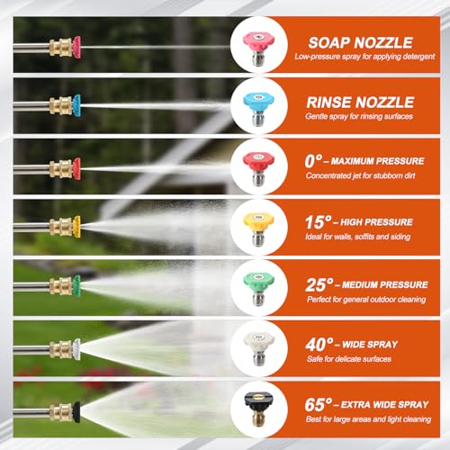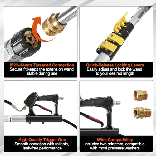 - 【Wide Compatibility with Most Pressure Washers】Equipped with a 3/8" quick-connect fitting, compatible with both electric and petrol pressure washers up to 4000 PSI. Supplied adapters convert to M22 14mm and 15mm connections, fitting most UK pressure washer hoses securely with no leakage.