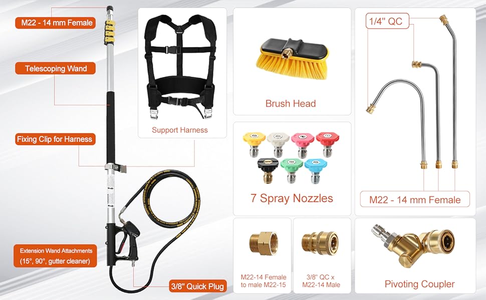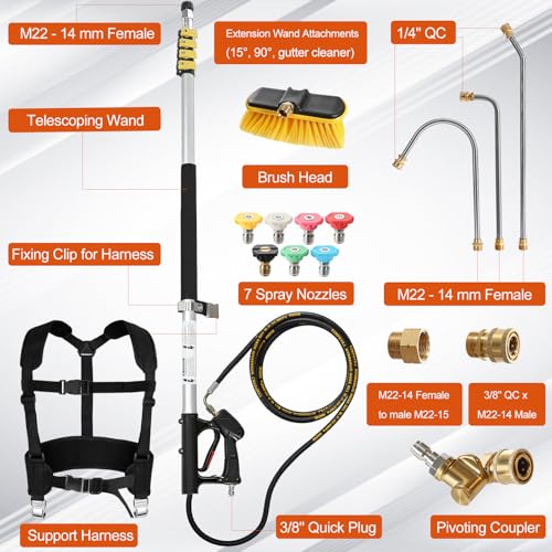 24FT Telescopic Pressure Washer Wand with Brush, Gutter Cleaning Lance Kit, Power Washer Extension Pole, Includes 3 Curved Stainless Steel Wands, Support Strap & 7 Spray Nozzles