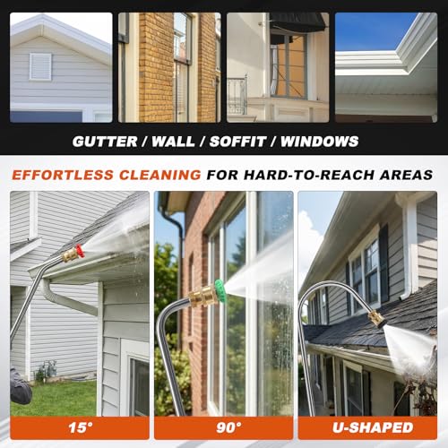 - 【Complete Gutter Cleaning & Extension Kit】Includes 24ft telescopic spray wand, adjustable support strap, 7 spray nozzle tips, 2 hose adapters, 1 cleaning brush, and 3 stainless steel curved extension wands (30°, 90° & 120°) – everything you need for versatile and effective pressure washing.