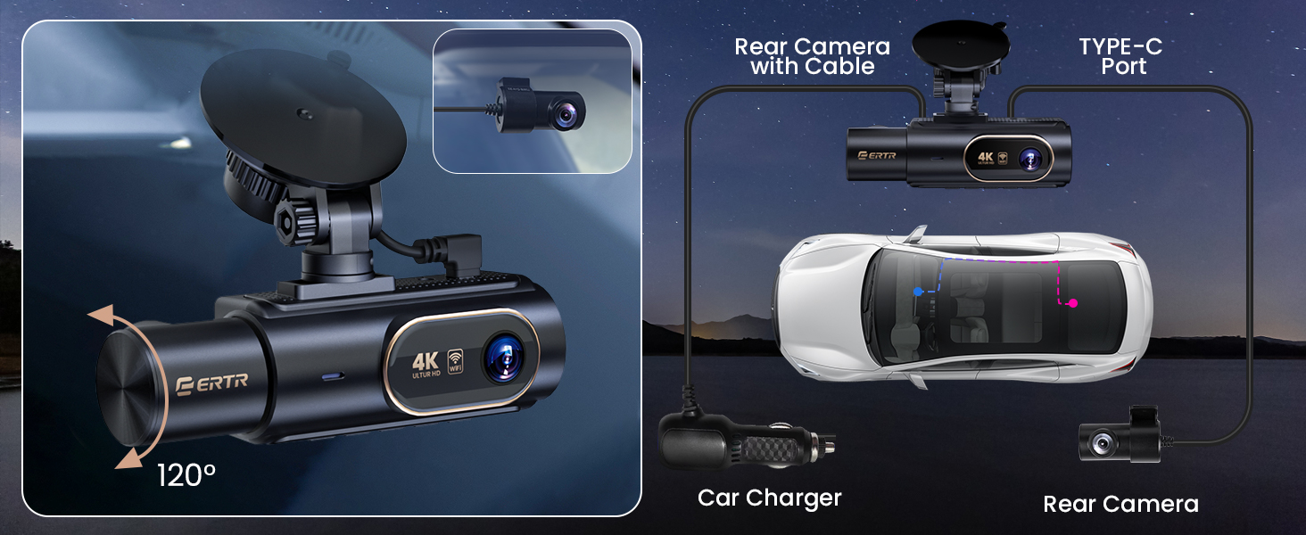 【Superior Night Vision & Wide-Angle Lenses】Equipped with advanced Wide Dynamic Range (WDR) and enhanced low-light sensors, the ERTR dash cam automatically balances bright headlights and dark surroundings to deliver clear footage night and day. The ultra-wide viewing angle captures vital details like license plates and faces—even in poorly lit conditions—giving you reliable video evidence when you need it most.