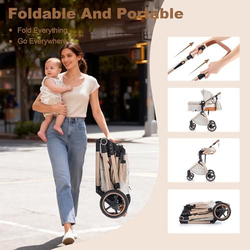 - 【Foldable & Space-Saving Design】Our unique design allows the stroller to be fully folded, significantly reducing the storage space needed when not in use. This innovative feature makes it ideal for homes with limited space and for family trips. Combined with easy-quick folding mechanism, this pram is built for modern, on-the-go parents