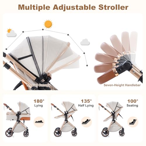 - 【Adjustable Features & Superior Comfort 】The 7-level adjustable handlebar accommodates parents of all heights. The extendable 5-panel canopy features sun protection, also includes a large zip-open peek-a-boo window for ventilation and checking on your baby. The openable leather bumper can allowing the infant to be lifted without disturbing your baby