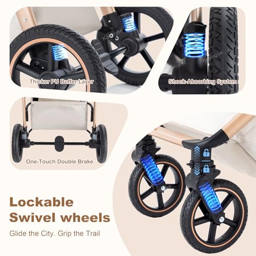 - 【All-Terrain with 4-Wheel Suspension】Enjoy a smooth ride on any surface. Both front and rear PU wheels feature independent built-in suspension springs to absorb shocks and bumps. The durable PU material is more wear-resistant than standard EVA wheels. Front wheels can be locked straight for stability or left to swivel 360° for effortless manoeuvrability