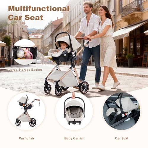 3 in 1 Travel System, Foldable Pram, 7 Height-Adjustable Handle, Stroller 4-PU Wheel Suspension, Baby Pram with Mosquito Net Raincover, Newborn Pushchair 0-3 Years
