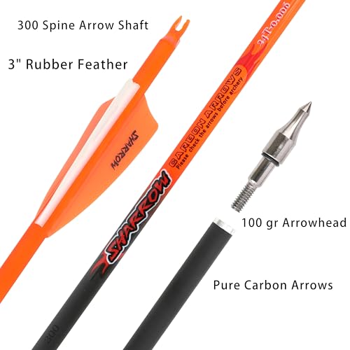 33“ Archery Pure Carbon Arrow 300 Spine ID 6.2mm With 3” Rubber Feather Hunting Arrow for Outdoor Hunting Target Archery Shooting Training (6/12pcs)