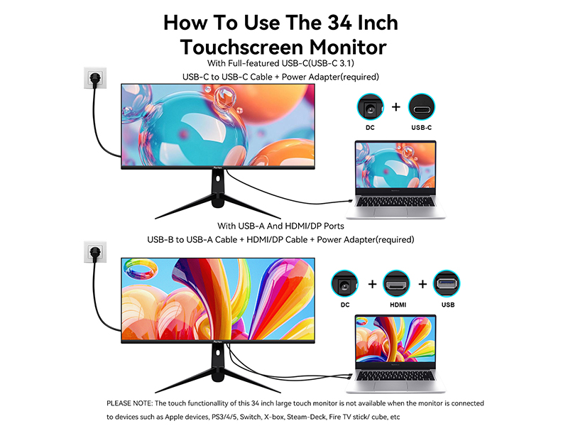 - How to Use The Touch Functionality of The Monitor: Firstly, if your device has a full-featured USB-C port, simply connect it to the monitor's USB-C port via a USB-C to USB-C cable to achieve touch functionality. Secondly, if your device does not have a USB-C port but has a USB-A port, you need to use a USB-A to USB-B cable to connect to the USB-B interface of the monitor to achieve the touch functionality. Please Note: The touch functionallity of this 34 inch touchscreen monitor is not available when the monitor is connected to devices such as Apple devices, PS3/4/5, Switch, X-box, Steam-Deck, Fire TV stick/ cube, etc