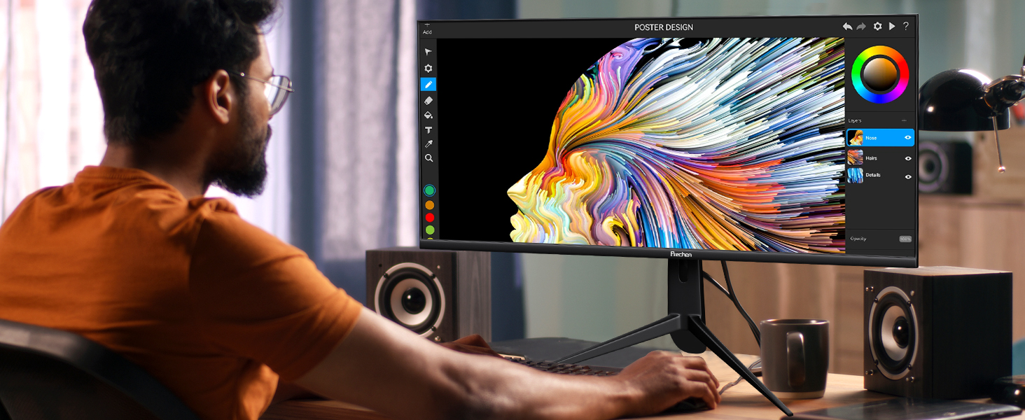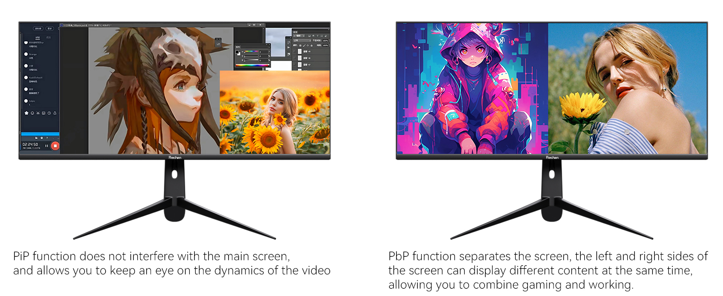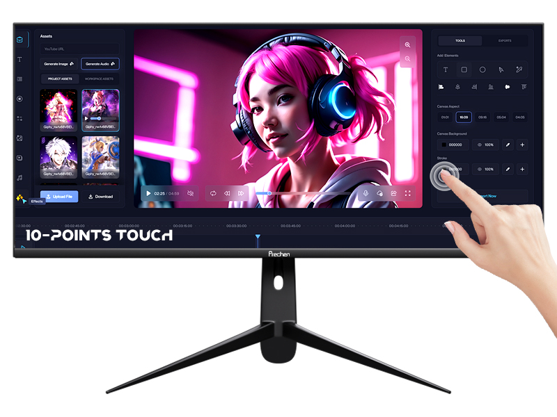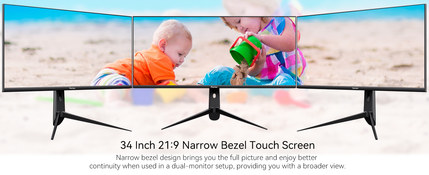 The large touch monitor with WQHD 3440×1440 high resolution for more details, which offers sharp, brillant and stunning images. With 21:9 aspect ratio and 3-sided frameless design of the 34 inch touchscreen monitor provides you with bigger screen space for expend your productivity.