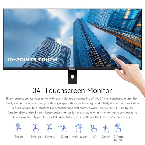 Experience seamless interaction with the multi-touch capability of this 34 inch touchscreen monitor. Easily swipe, zoom, and navigate through applications, enhancing productivity for professionals who require an intuitive interface for presentations and creative work. PLEASE NOTE: The touch functionallity of this 34 inch large touch monitor is not available when the monitor is connected to devices such as Apple devices, PS3/4/5, Switch, X-box, Steam-Deck, Fire TV stick/ cube, etc