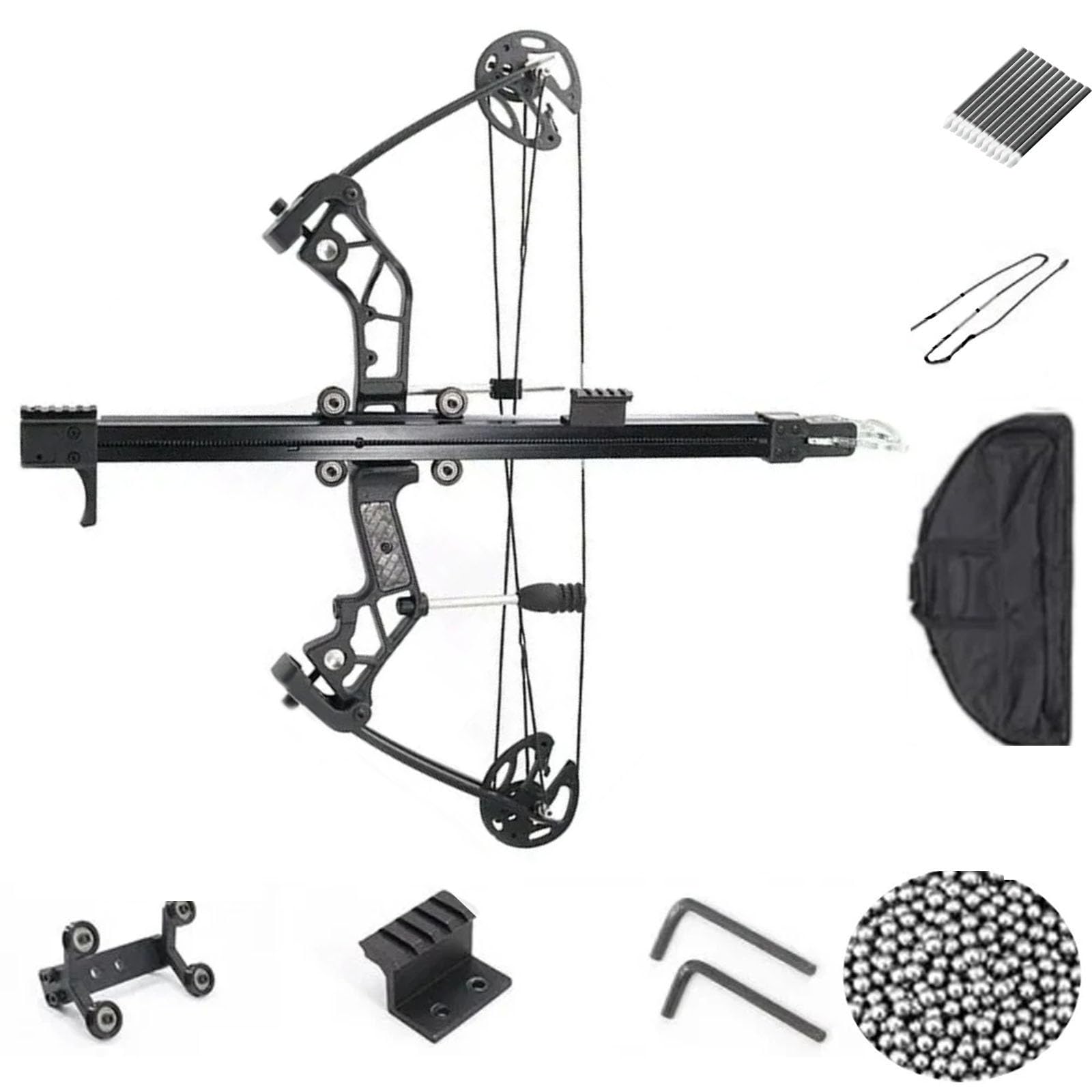 - The packaging includes :1 * Dual-purpose compound bow. 50 * steel bell. 1 * rear base. 2 * wench. 1 * shooter mount. 10 * mini Arrow. 1 * Extra Bowstring. 1 * Storage bag.