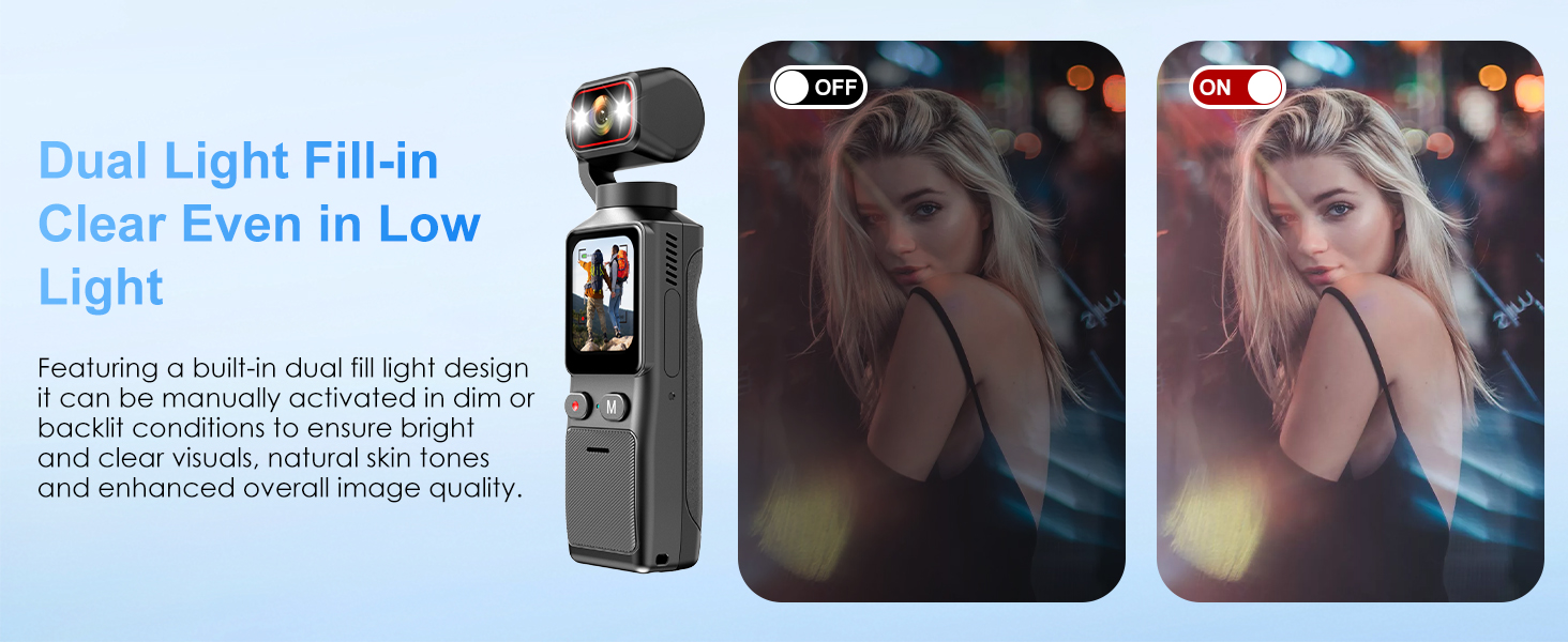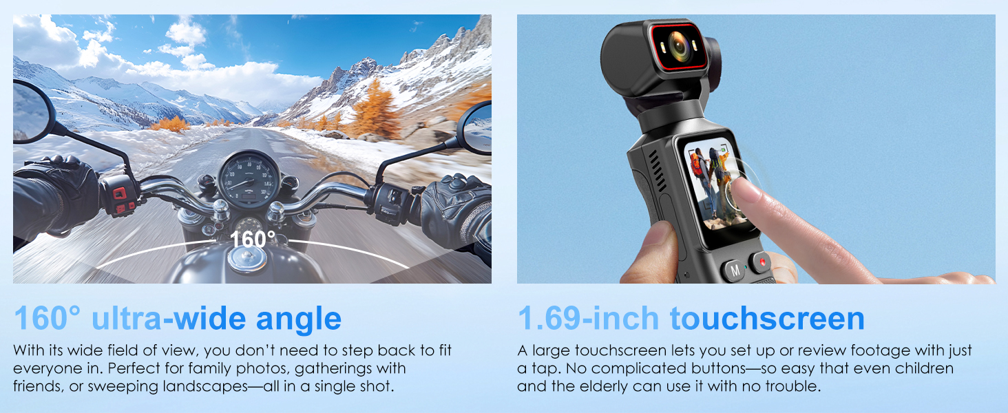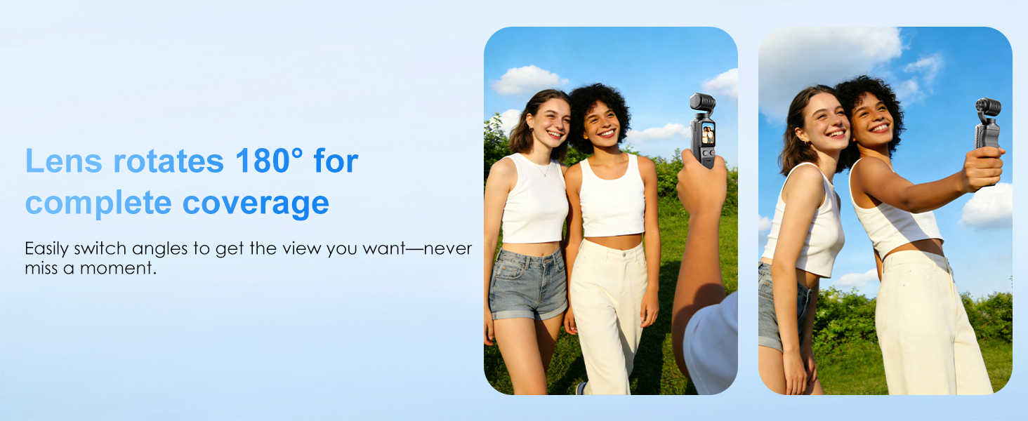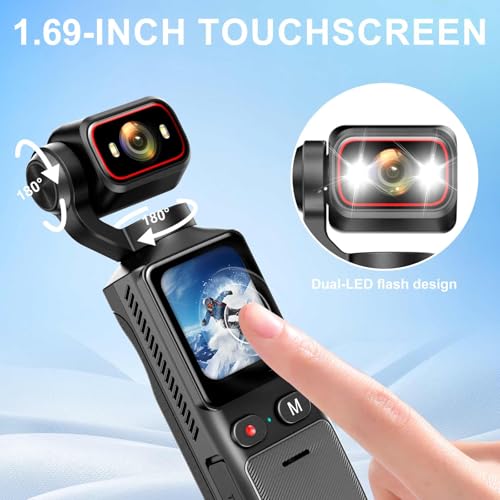 180° Rotatable Lens & 1.69-inch Screen: Featuring a manually adjustable 180° rotatable lens, you can easily switch shooting angles and preview your composition in real time on the screen. Paired with a 1.69-inch touchscreen and dual fill lights, it offers intuitive operation and natural lighting—perfect for selfies, low-light conditions, or creative multi-angle shooting.