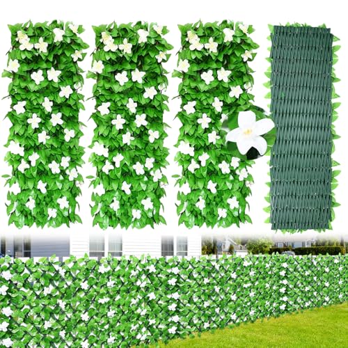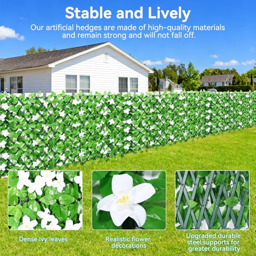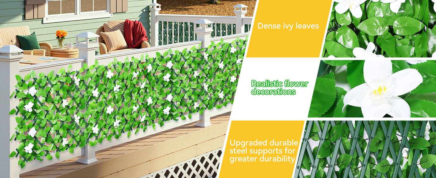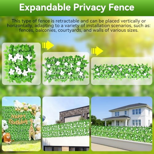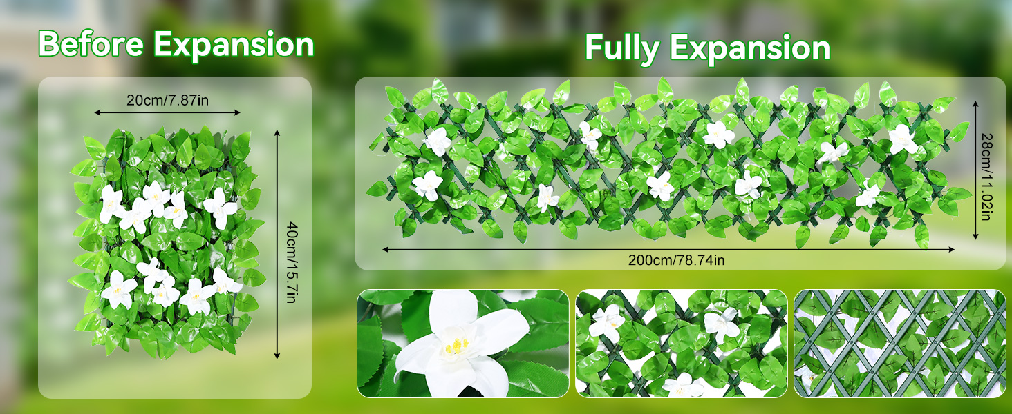 【EXPANDABLE FAUX PRIVACY FENCE, CREATE YOUR IDEAL SPACE】 The artificial ivy fence screening measures just 40 x 20 cm, while the artificial trellis screening can be manually expanded to 30 x 200 cm, easily adapting to various spaces like balconies, terraces, and windows. The expandable trellises can be positioned vertically or horizontally, and the fence height varies with the width, allowing you to customize your green wall and instantly create a lush and private living space.