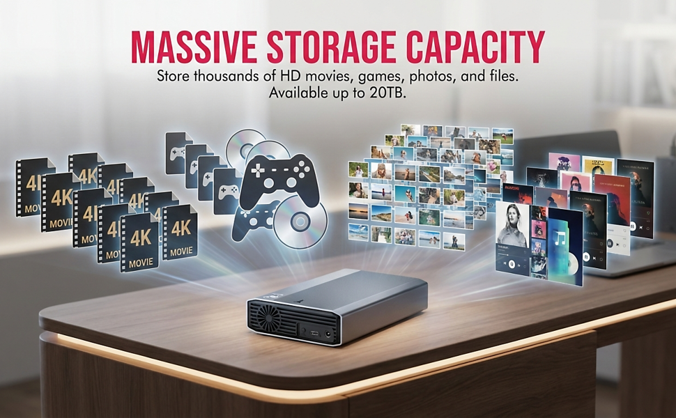 Stop deleting your favorite memories to make room for new ones. The Modustech Desktop Hard Drive offers massive capacity options ranging from 3TB up to 20TB, serving as your central digital warehouse. Whether you are a creative professional archiving years of 4K video footage and high-resolution RAW photos, or simply looking to back up your entire family's digital history, this drive handles it all.