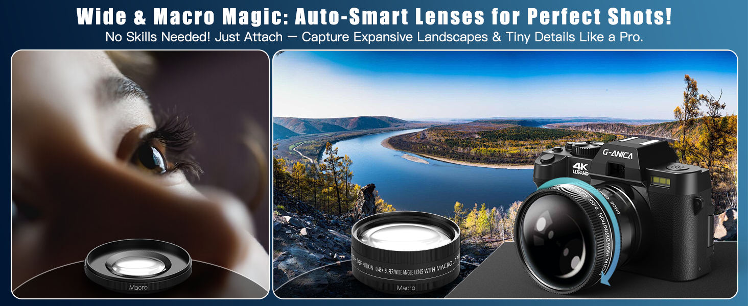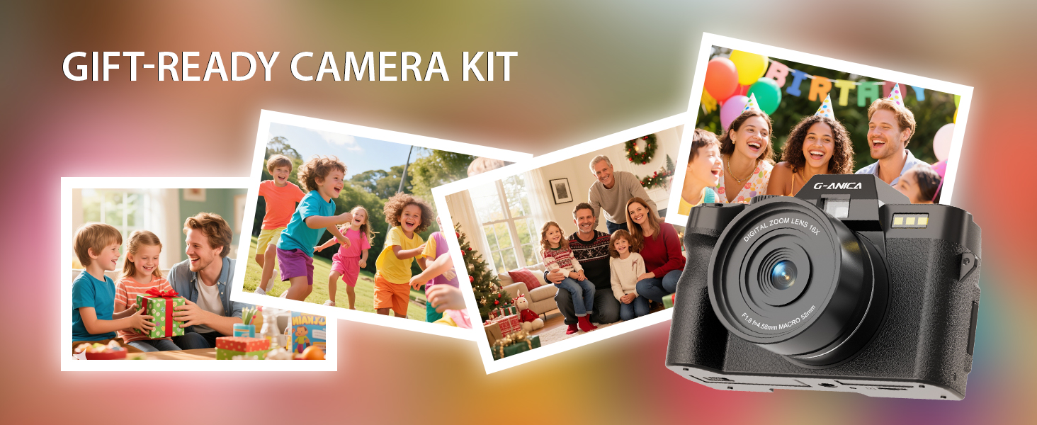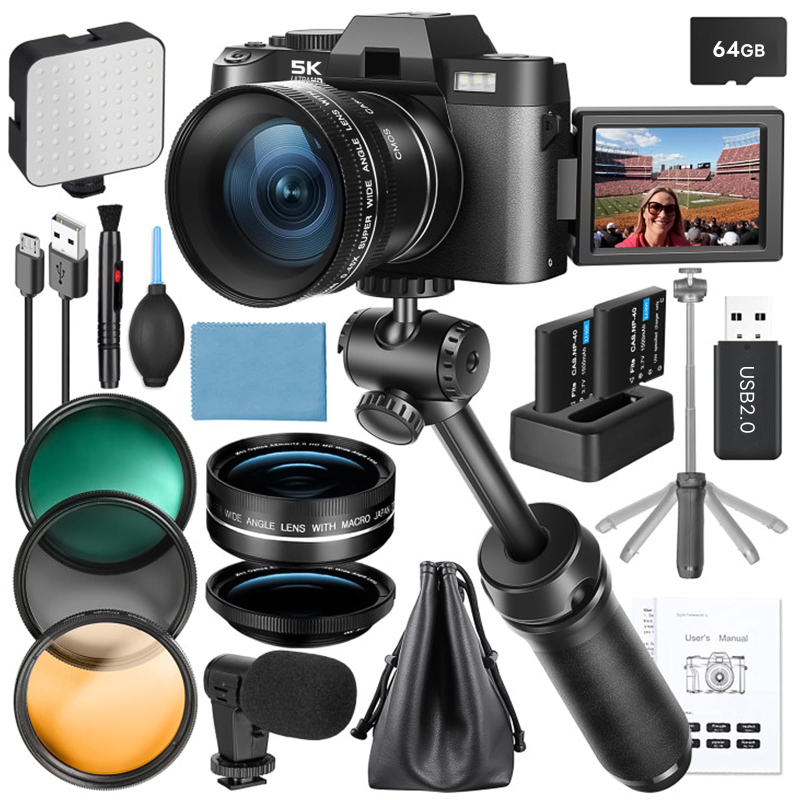 【Rich 5K Digital Camera Kit】 G-Anica vlogging camera kit contains 5K camera * 1, microphone * 1, tripod * 1, filter * 3, wide-angle lens * 1 and macro lens * 1, cleaning kit * 1, fill light * 1, 64GB TF card * 1, card reader * 1, battery * 2, charger * 1, camera bag * 1 and lanyard * 1. Numerous accessories have strong practicality, making your photography more interesting