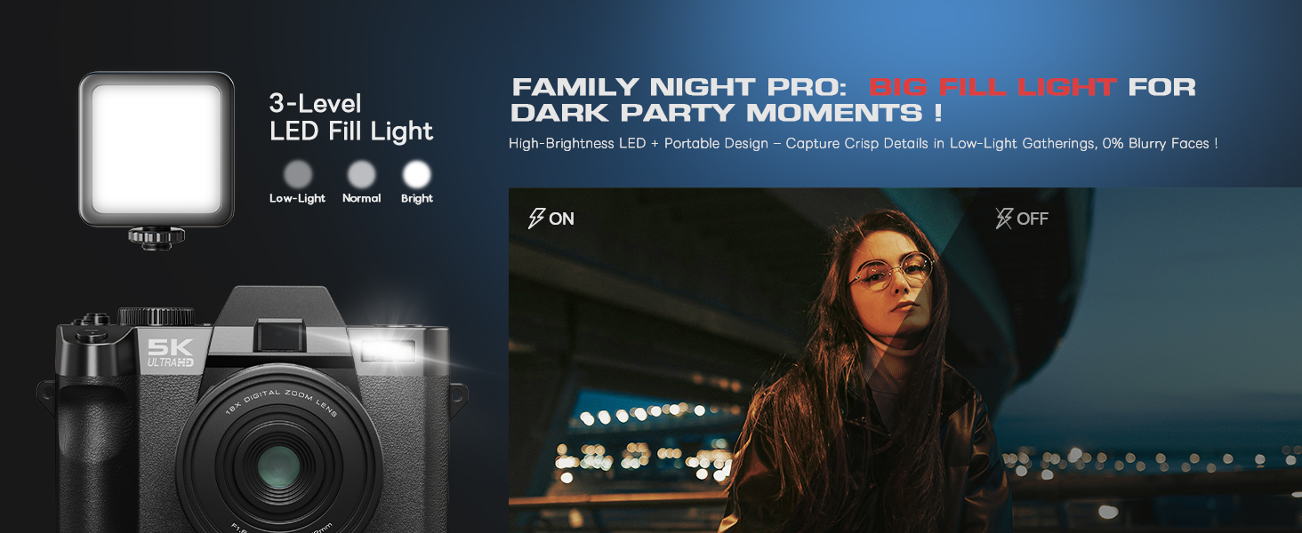 【3-Color Filter & Big Fill Light】3-color filter can see different worlds during shooting, stimulating our imagination. In addition to the built-in fill light of the camera, an additional large fill light is also provided to make your photos clearer in the dark. This video recording camera comes with a 64GB TF card and card reader, no additional purchase required, making it convenient for you to use this blog camera directly.