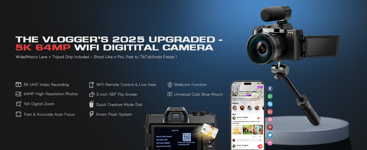 5K Digital Cameras for Photography, 64MP for Vlogging YouTube with Microphone&Tripod Grip, Video Camera with Wide-Angle&Macro Lens,WiFi,AUTOFOCUS 16X Zoom,Content Creator Kit, Travel Camera 64GB Card
