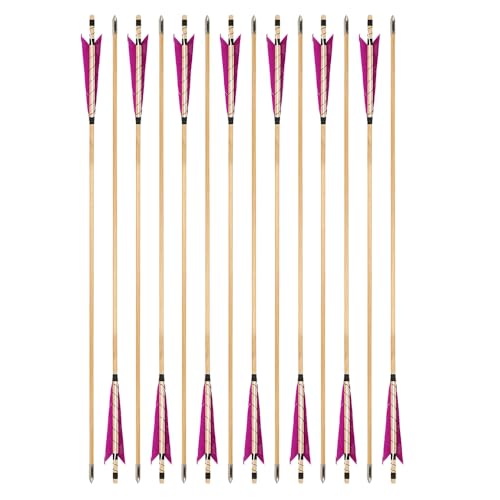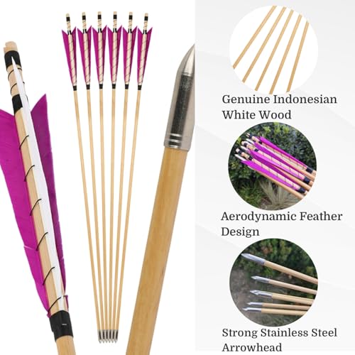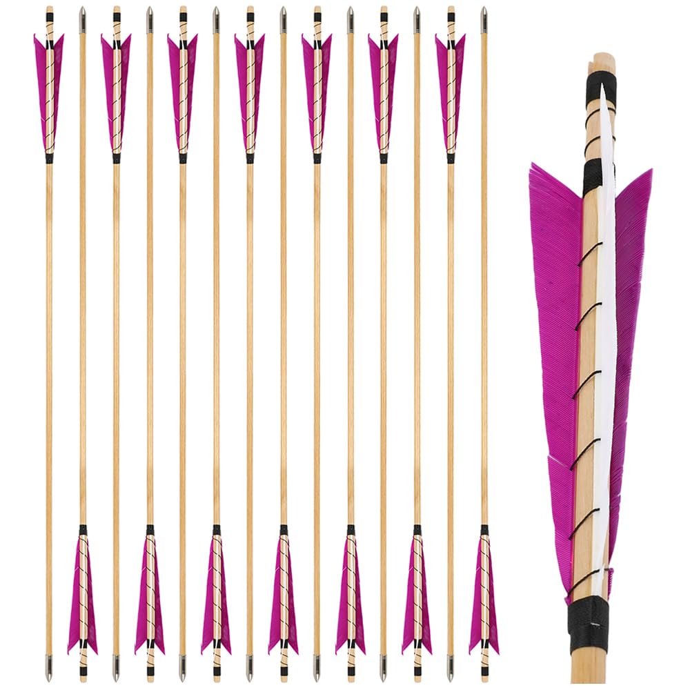 6/12pcs 32.3Inch Wooden Arrow 8mm Shaft Stainless Steel Arrowhead 5″ Turkey Feathers for Traditional Recurve Bow Longbow Hunting Shooting Targe