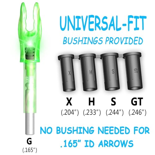 - Universal Fit and Compatibility: lighted nocks universal for arrows .165".204"&233"&244"&246", with X,H, S, GT Bushings.
