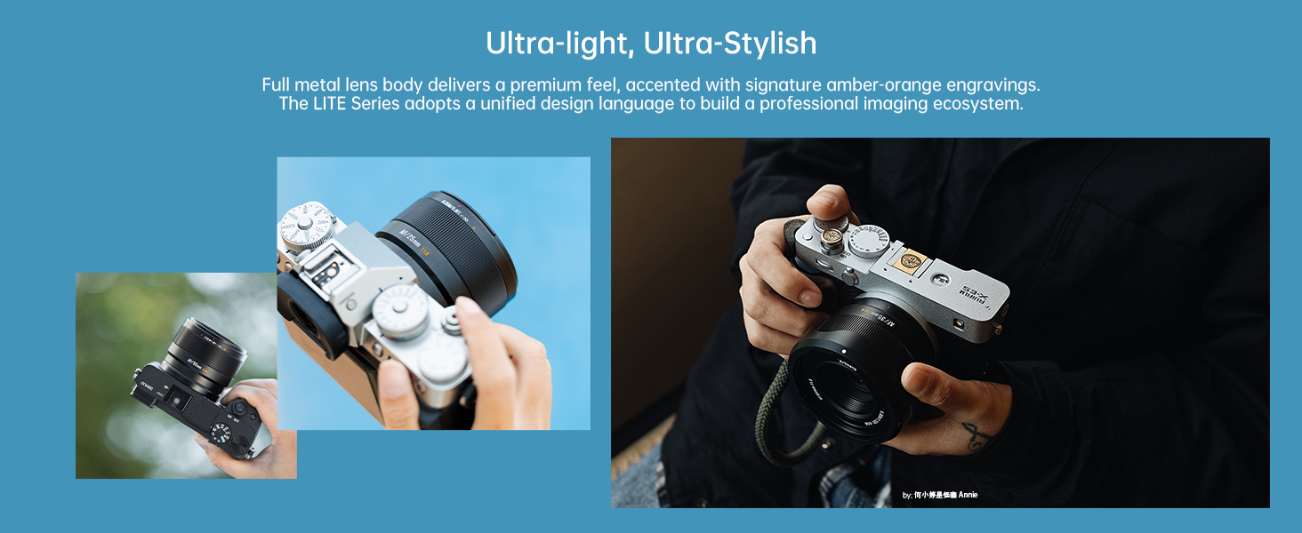 【Lightweight Metal Body 】 7artisans 35mm F1.8 lens all-metal lens body boasts an exceptional feel and weighs about 181g, making it compact and lightweight, so you won't get tired of shooting for extended periods; the LITE series features a unified aesthetic design that balances performance and appearance.