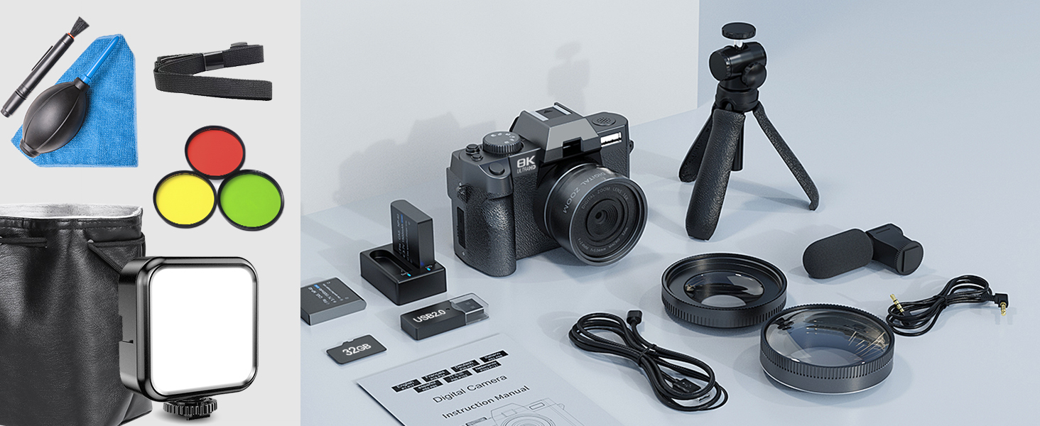 【Complete Creator Kit — Unbox Your Creativity, Start Filming in Minutes】 Inside, everything sits ready: a microphone that catches your voice clearly over city noise, a tripod for buttery-smooth time-lapses of clouds, three color filters to give your videos warmth or drama, wide-angle + macro lenses to expand your view, an extra flash, and two batteries that last through a full day of shooting. This isn’t just a camera—it’s your all-in-one storytelling partner.